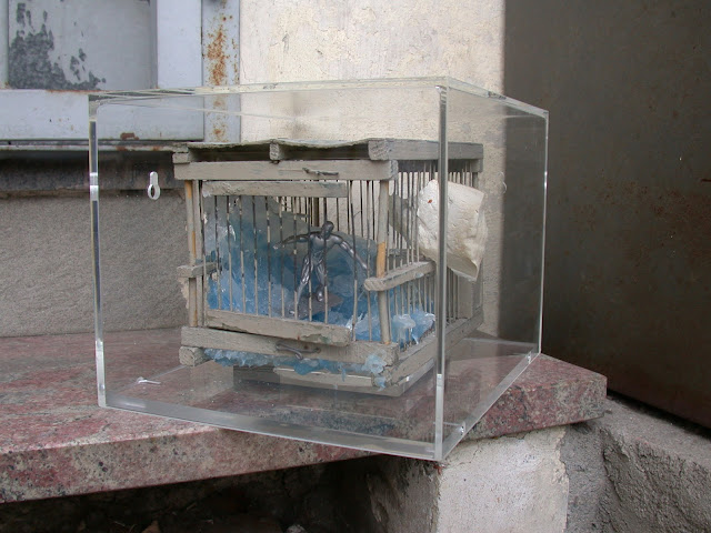 collage and assemblage, blue glass paste, plastic soldier, plastic little bear, metal, phials, in wooden box 16,5x11x6cm. (closed) - 16,5x21x11 cm. ( opened), 2012
